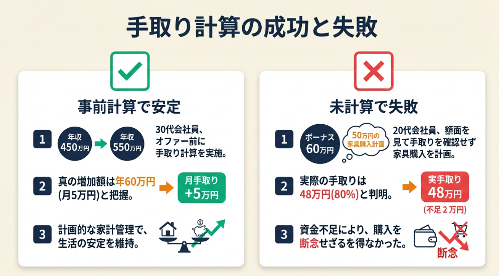 実際の体験談をもとに、手取り計算の成功パターンと失敗リスクを見ていきましょう。