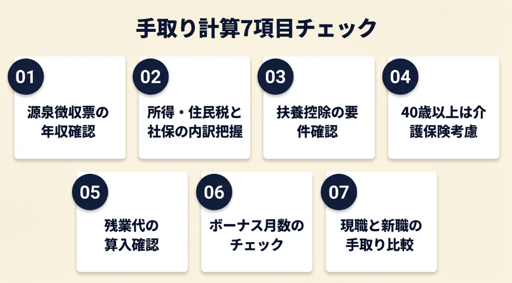 | チェックリストが欲しい | 手取り計算は7項目でチェック | 3分 |