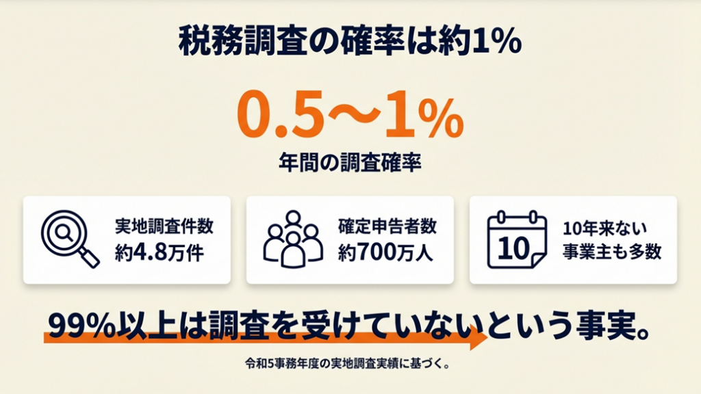 個人事業主に税務調査が来る確率は年間約0.5〜1%で、来ない年が続くのは統計的にも自然です。国税庁の発表では令和5事務年度の実地調査件数は約4.8万件。ただし「来ない=安全」ではなく、来たとき7年分遡及される前に備えておくことが重要です。本記事の情報は2026年3月時点のものです。
