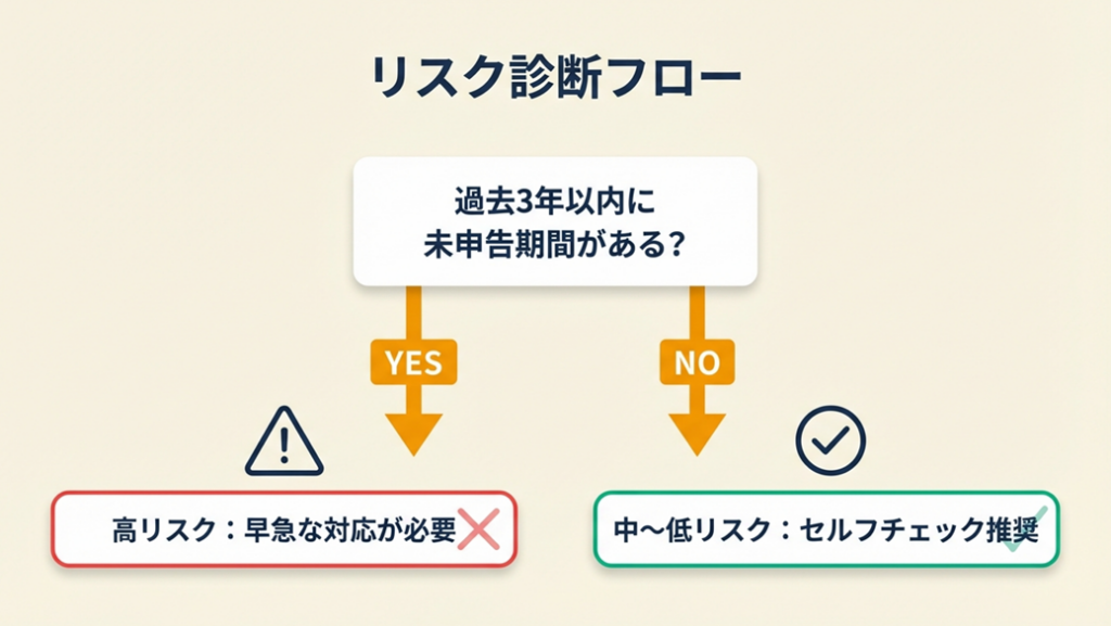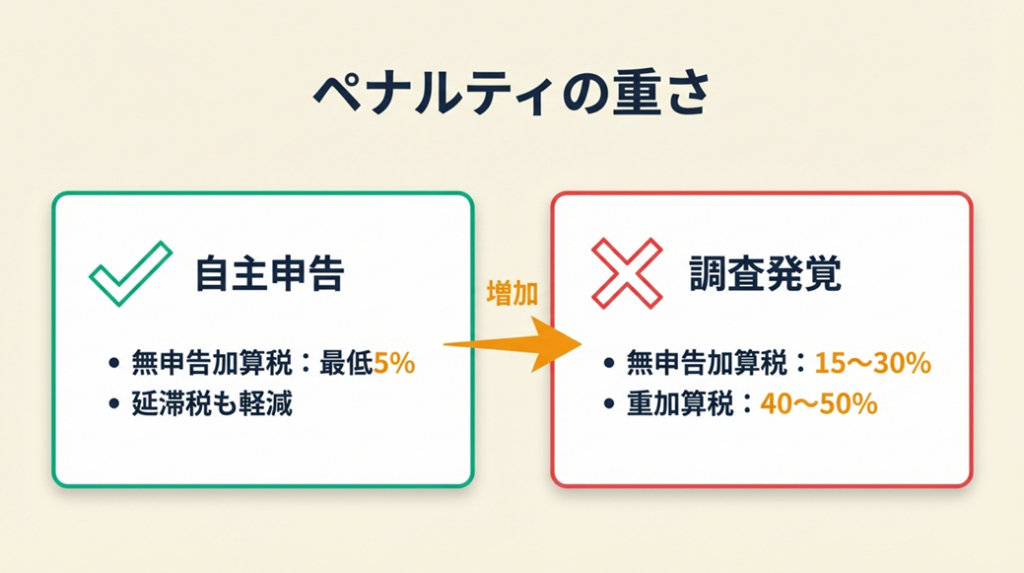 無申告が発覚した場合のペナルティは想定外に重くなります。詳しくは「確定申告の修正期限と無申告リスク」もご参照ください。