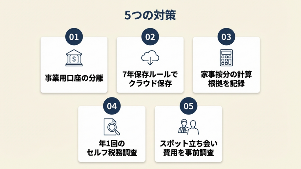 - 【なぜ効くのか】: 税務調査官が1日かけてチェックする内容は、慣れれば自分で2〜3時間で大部分を確認できます。問題を先に発見して自主修正すれば加算税のリスクを最小化でき、「気づかずに放置」するより圧倒的に有利な状態になります。