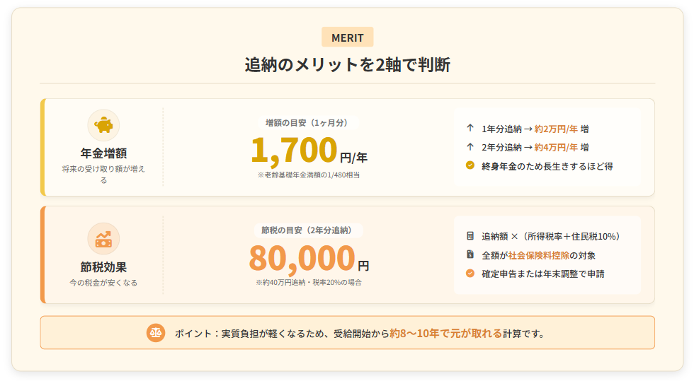 追納すべきか迷う方も多いでしょう。追納のメリットは「年金増額」と「節税効果」の2軸で評価できます。