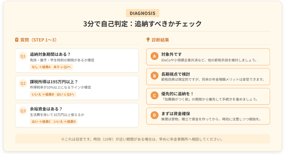 【注意点】 追納した年の確定申告でのみ控除できます。過去に遡っての控除はできません。追納したら必ずその年の確定申告で申告してください。個別の状況については税理士への相談も検討してください。