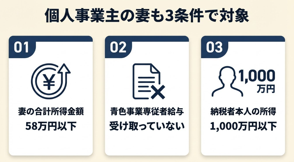 個人事業主の妻でも、以下の3条件をすべて満たせば配偶者控除の対象です。妻が個人事業主・会社員・パートのいずれであっても、判定基準は同じです。