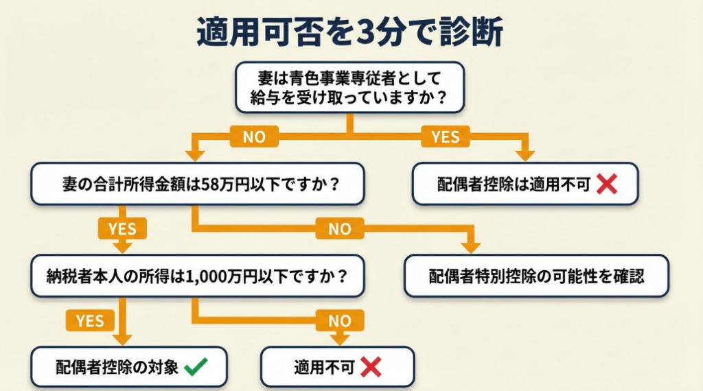 妻が青色事業専従者として給与を受け取っているかどうかを確認してください(5分)。受け取っている場合は配偶者控除との併用ができないため、専従者給与との有利判定が次のステップです。