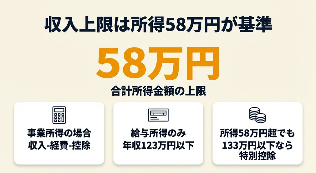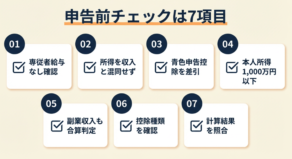 ただし、個人事業主には給与所得控除がないため、事業所得の金額で直接判定します。「年収」ではなく「合計所得金額」で考えてください。