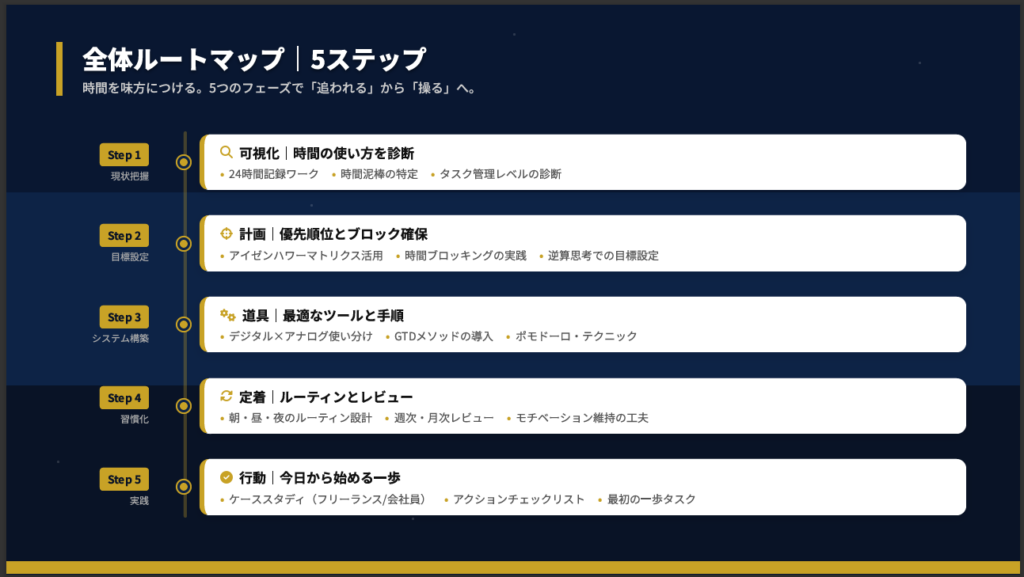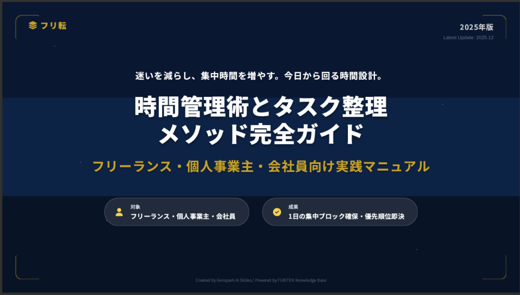 本記事は「時間管理術とタスク整理メソッド完全ガイド」の内容を元に作成しています。 より詳しい図解・チェックリスト・計算シートは、以下からダウンロードできます。