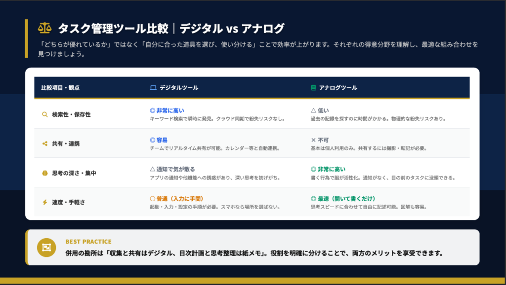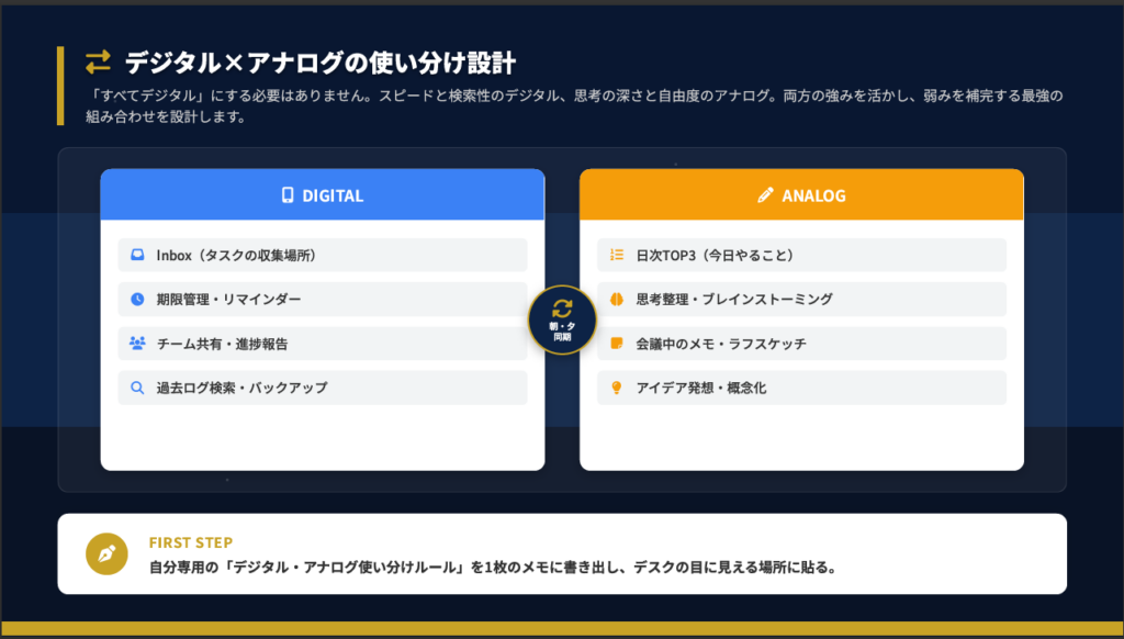 個人的な最適解は、収集と共有はデジタル、日次計画と思考整理は紙メモという使い分けです。朝と夕方に同期するタイミングを設けることで、両方のメリットを享受できます。