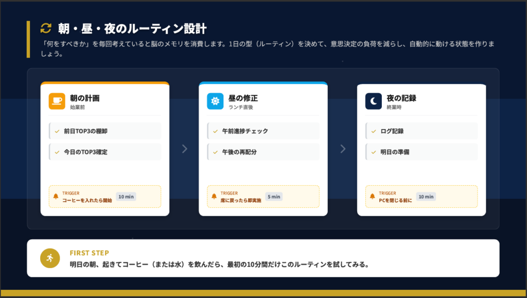 「何をすべきか」を毎回考えていると脳のメモリを消費します。1日の型(ルーティン)を決めて、意思決定の負荷を減らしましょう。