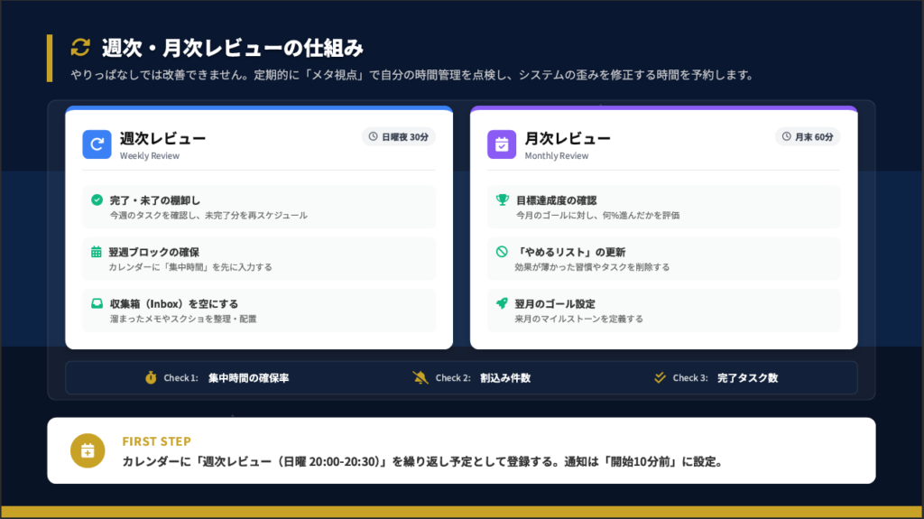 やりっぱなしでは改善できません。週次レビューでは完了・未了の棚卸し、翌週ブロックの確保、収集箱を空にする作業を行います。月次レビューでは目標達成度の確認、やめるリストの更新、翌月のゴール設定を行います。