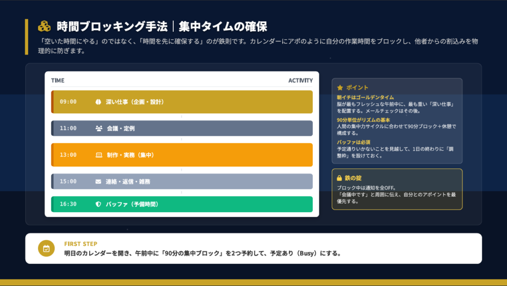 カレンダーにアポのように自分の作業時間をブロックし、他者からの割込みを物理的に防ぎます。経験上、以下のような配置が効果的です。