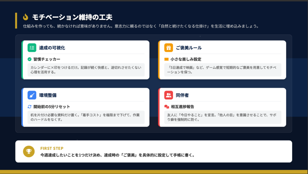 | ご褒美ルール | 5日達成で映画など短期的な楽しみを設定 | 報酬があると頑張れるタイプ |