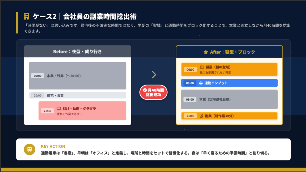 会社員の副業時間捻出では、帰宅後にSNSや動画を見てダラダラ過ごし、疲れて作業できないという状態から、朝型にシフトして月40時間を捻出することに成功しました。