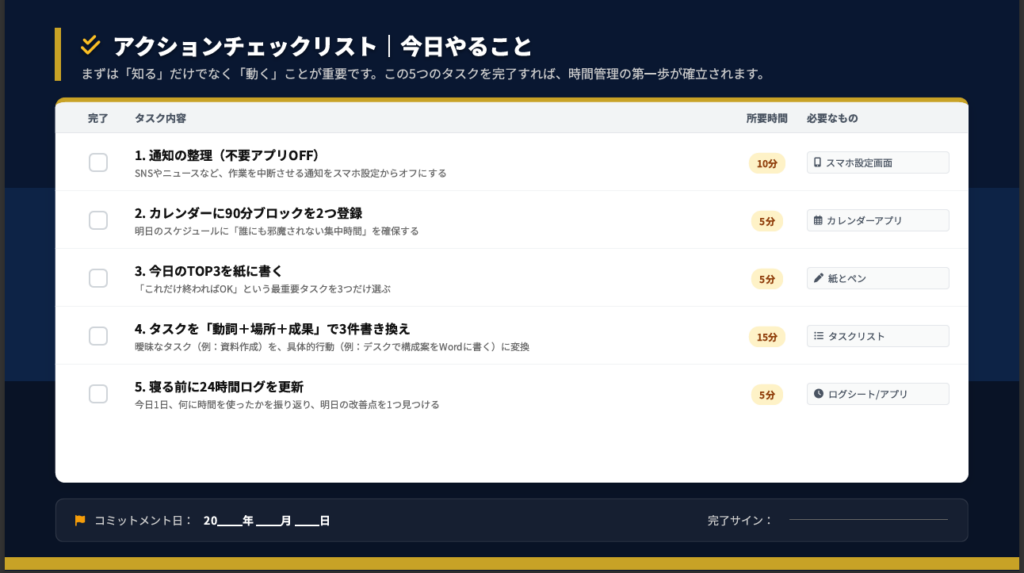 時間管理術は、一度身につければ一生使えるスキルです。「知る」だけでなく「動く」ことが重要です。この記事で紹介した5つのタスク(通知の整理、集中ブロック登録、TOP3の書き出し、タスクの具体化、24時間ログの更新)を今日から1つずつ実践してみてください。40分で全て完了できます。