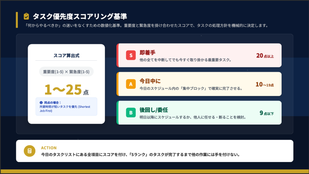 迷いをなくすには、数値化基準を持つことが有効です。重要度(1〜5点)と緊急度(1〜5点)を掛け合わせた総合スコア(1〜25点)でタスクを評価し、機械的に処理方針を決定します。