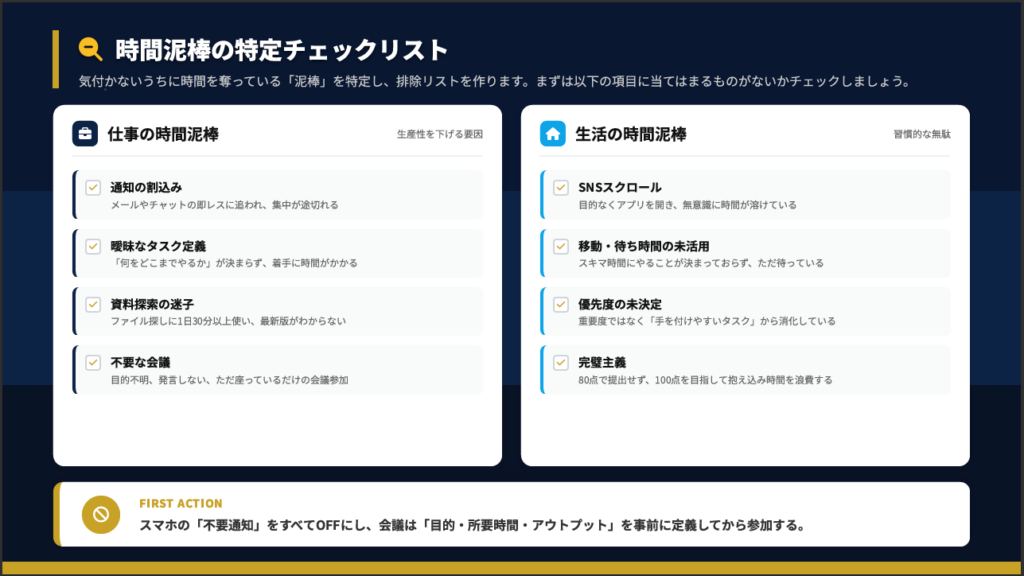 まず取り組むべきは、昨日の行動を30分刻みで紙に書き出すことです。思い出せない空白の時間が「使途不明時間」であり、ここに改善の余地が眠っています。