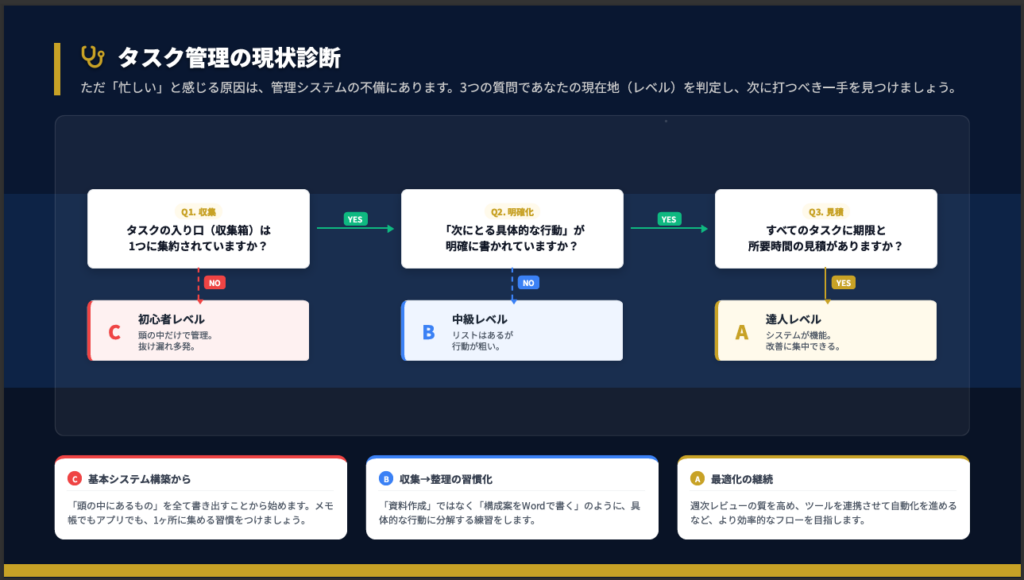 あなたの現在地を確認してみましょう。タスクの入り口(収集箱)が1つに集約されていなければ初心者レベル、「次にとる具体的な行動」が明確でなければ中級レベルです。全てのタスクに期限と所要時間の見積もりがあれば達人レベルといえます。