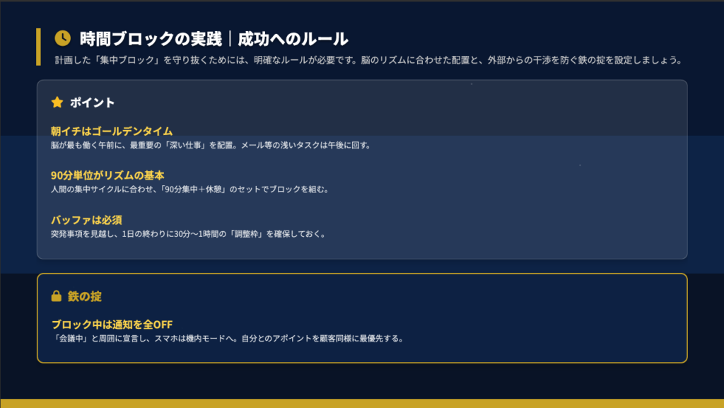 脳が最もフレッシュな午前中に、最も重い「深い仕事」を配置します。メールチェックはその後です。人間の集中力サイクルに合わせて90分ブロック+休憩で構成し、予定通りいかないことを見越して1日の終わりに調整枠を設けます。