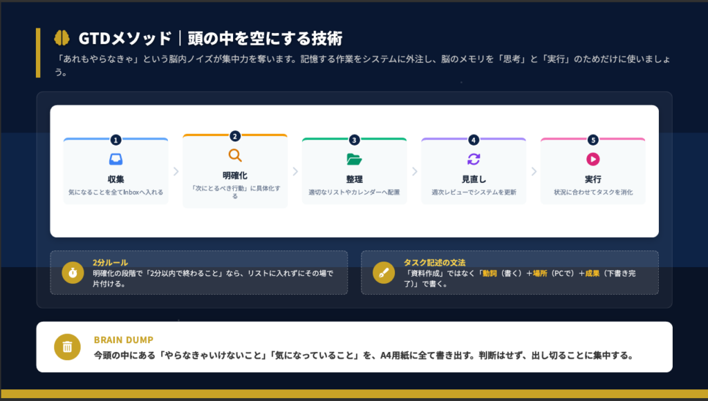 「あれもやらなきゃ」という脳内ノイズが集中力を奪います。GTDメソッドは、記憶する作業をシステムに外注し、脳のメモリを思考と実行のためだけに使う技術です。
