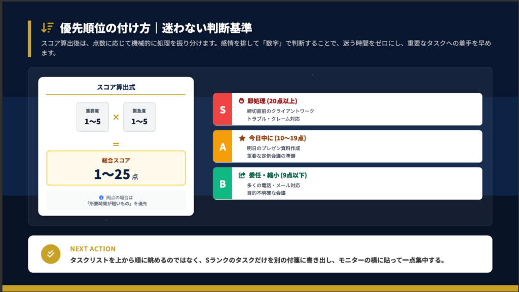 | 20点以上 | S(即着手) | 他の全てを中断して今すぐ取り掛かる | 締切直前、トラブル対応 |