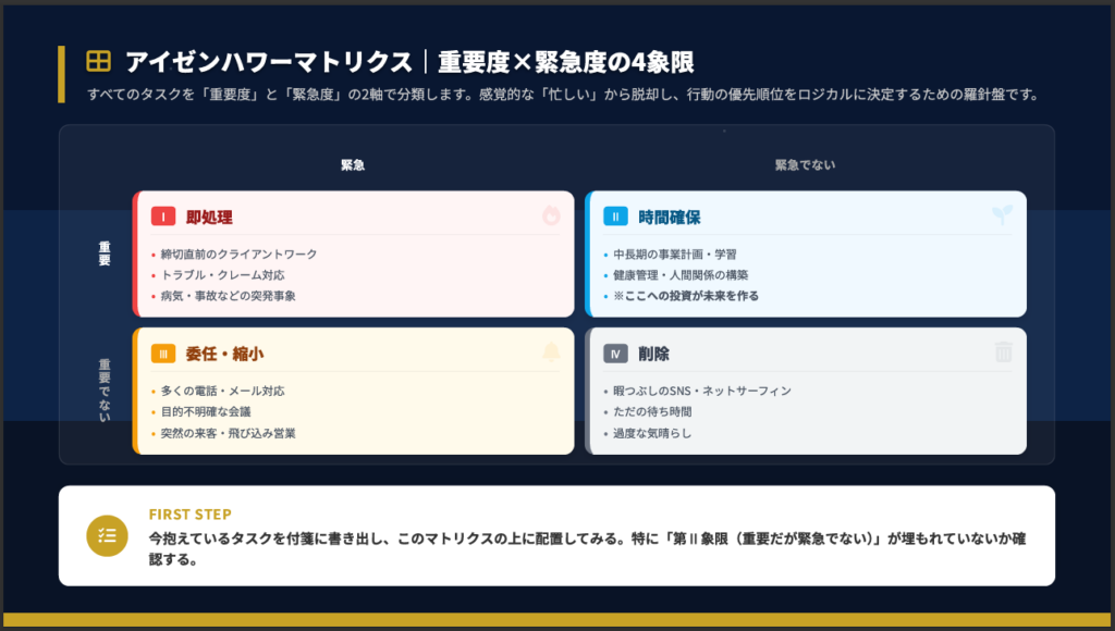 すべてのタスクは「重要度」と「緊急度」の2軸で分類できます。特に注意すべきは第Ⅱ象限(重要だが緊急でない)です。中長期の事業計画、学習、健康管理などがここに該当し、ここへの投資が未来を作ります。