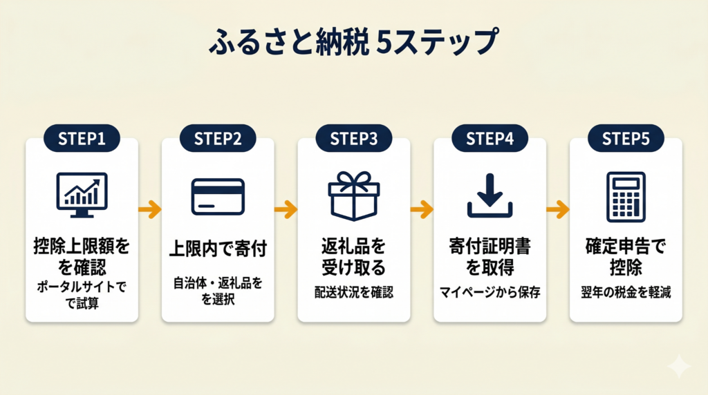 [最初の一歩]: さとふるを開き、評価4.5以上の食品カテゴリで5,000〜10,000円帯の返礼品を1件選んで申し込む(15分)