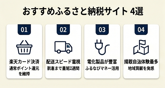 サイト選びで迷っている方は多くいます。2025年10月のポイント付与廃止により、サイト間の差別化は「返礼品の品揃え」「配送速度」「申告書類対応」「独自キャンペーン」の軸に移っています。「どの返礼品を受け取りたいか」「どの決済方法を使うか」という2軸で整理すると、選択肢が一気に絞られます。