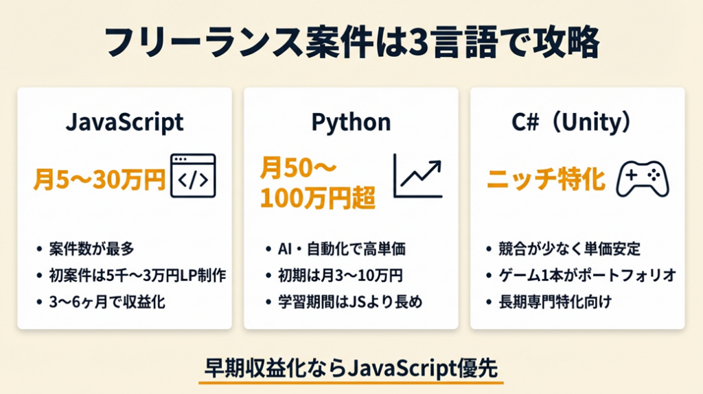 フリーランスや個人事業主として案件を受注することを前提にすると、言語選びの基準はさらに絞られます。案件数・単価・学習期間のバランスで3パターンが浮かび上がります。