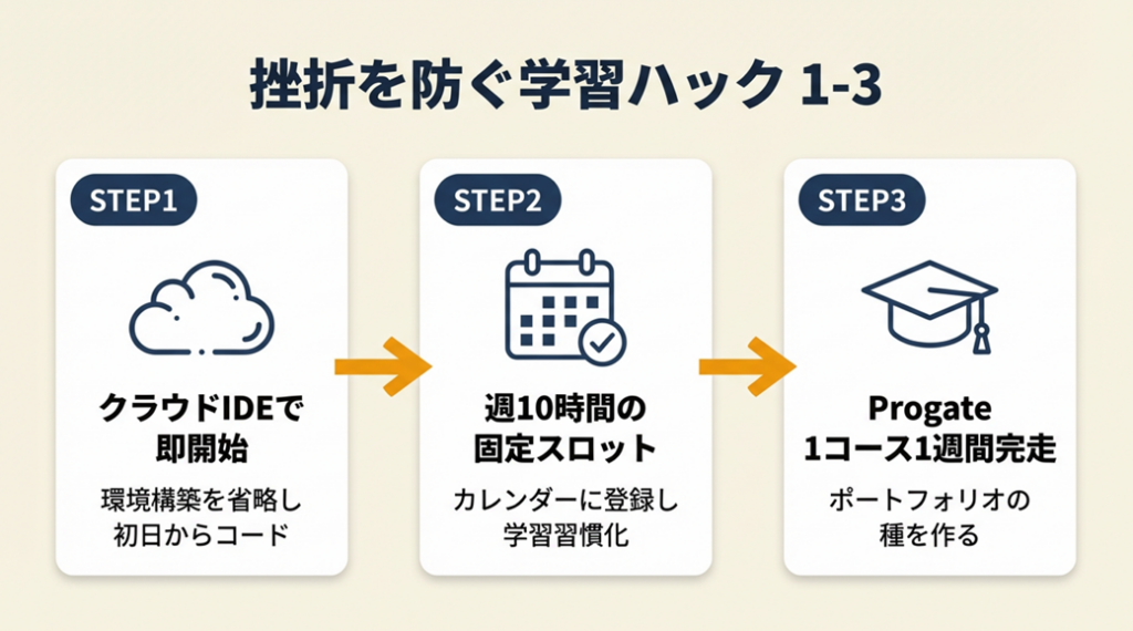 - [なぜ効くのか]: 環境構築が学習の「入口コスト」として機能し、多くの初心者がその段階で脱落します。クラウドIDEはその入口コストをゼロにします。コードを「書いて実行する」という成功体験を初日に得ることで、学習継続のための心理的モメンタムが生まれます。このモメンタムが3ヶ月間の学習継続率を高める根本的なメカニズムです。