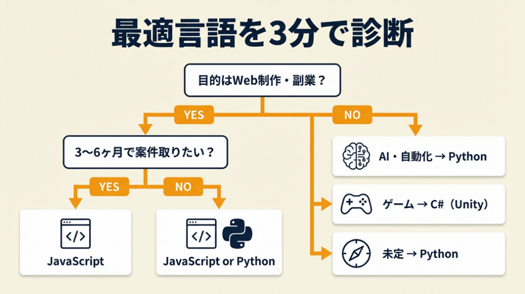 A: 副業・フリーランス案件を3〜6ヶ月以内に取りたいならJavaScriptを優先してください。1年以上の学習期間を取れるならPythonから始めてもよいです。「最初の収益化までの期間」で判断するのが合理的です。