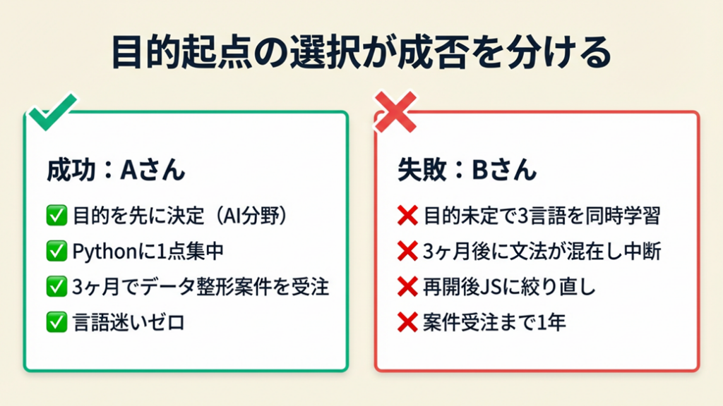 Bさんは「どれが良いか分からない」という状態でPython・Java・JavaScriptを同時に学習開始。3ヶ月後に文法が混在して混乱し、学習を中断。再開後にJavaScriptに絞って取り組み直し、最終的に案件受注まで1年かかりました。