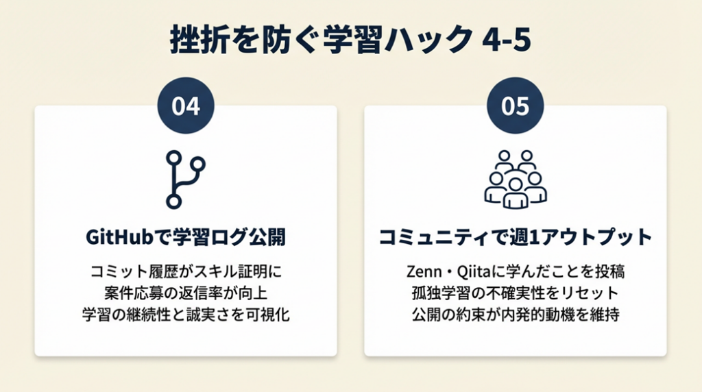 - [なぜ効くのか]: 孤独な独学は「自分が正しい方向に進んでいるか」という不確実性を常に抱えます。この不確実性が挫折感の最大要因です。週1回のアウトプットは他者の反応を通じて方向性を確認できるため、不確実性を週単位でリセットします。コミュニティへの公開という約束が「今週中に何かを学ばないと」という内発的動機を維持する根本メカニズムです。