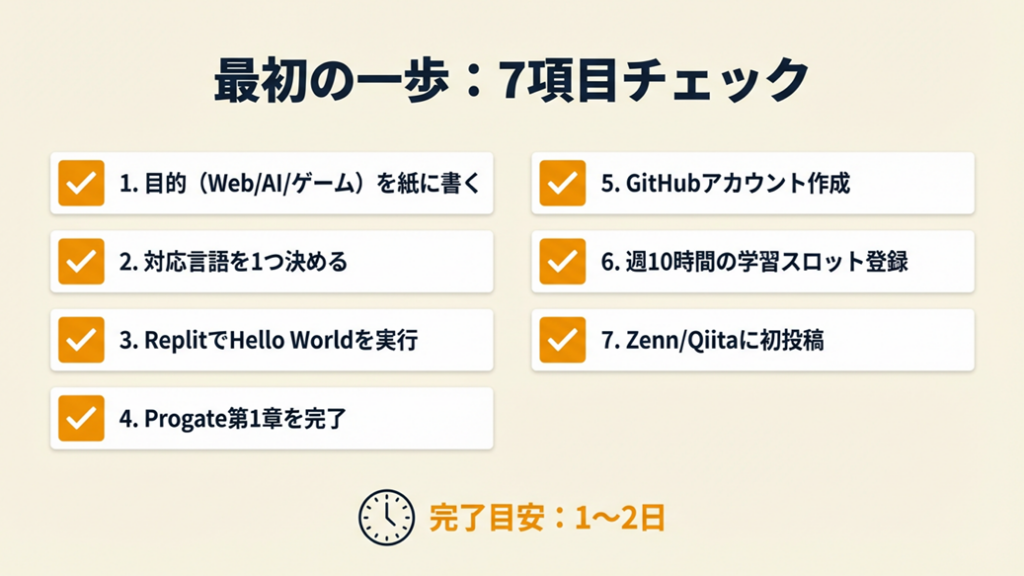 最初の行動を7項目に整理しました。これをすべて実行すれば、学習開始の準備が整います。