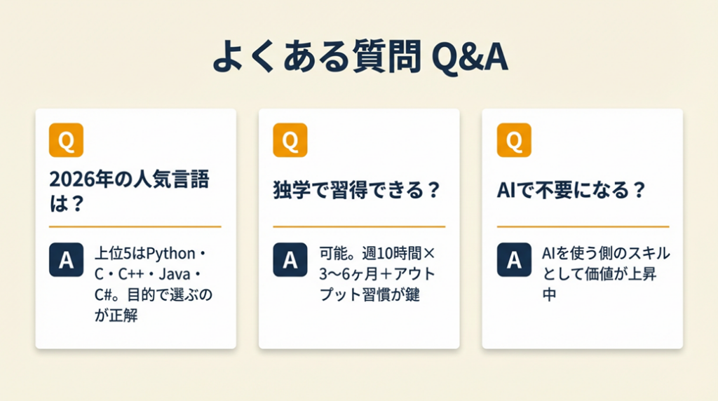 A: TIOBE Index 2026年3月時点では、Python・C・C++・Java・C#の順が上位5位を占めています。初心者の学習人口ベースでは日本国内でPythonとJavaScriptが選ばれており、学習教材・コミュニティともに最も充実しています。ランキングは参考程度にとどめ、最終的には「自分の目的に合うか」で選んでください。
