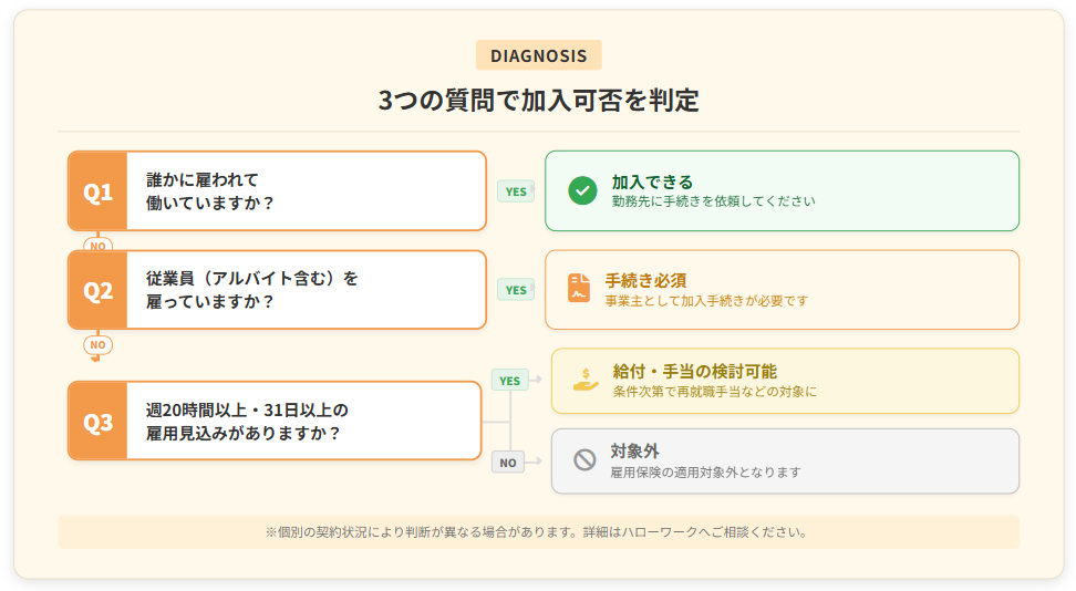 「自分は雇用保険に入れるのか」「どの手続きが必要なのか」――判断に迷う方向けの診断です。3分以内に判定できます。
