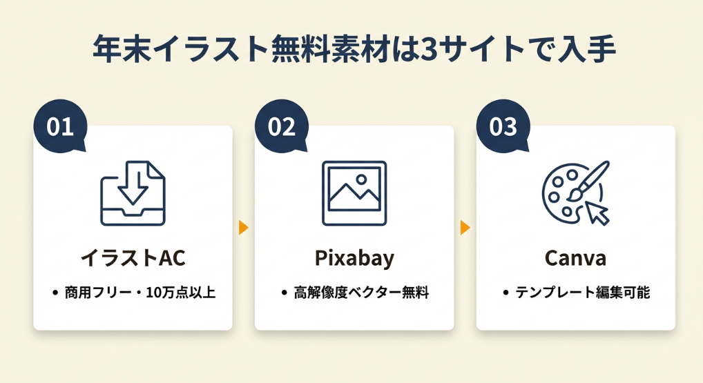 「無料で商用利用できる年末イラストが見つからない」という状況は、サイトの選び方で解決できます。ライセンス確認済みの3サイトを押さえれば、必要な素材はほぼカバーできます。