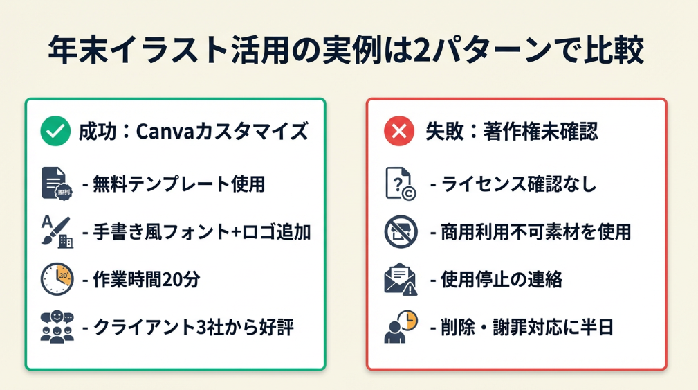 フリーランスの年末イラスト活用における成功パターンと失敗リスクを、具体的な事例で解説します。