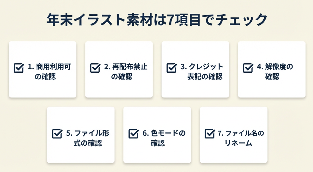 | ダウンロード前に確認すべき項目を知りたい | 年末イラスト素材は7項目でチェック | 3分 |