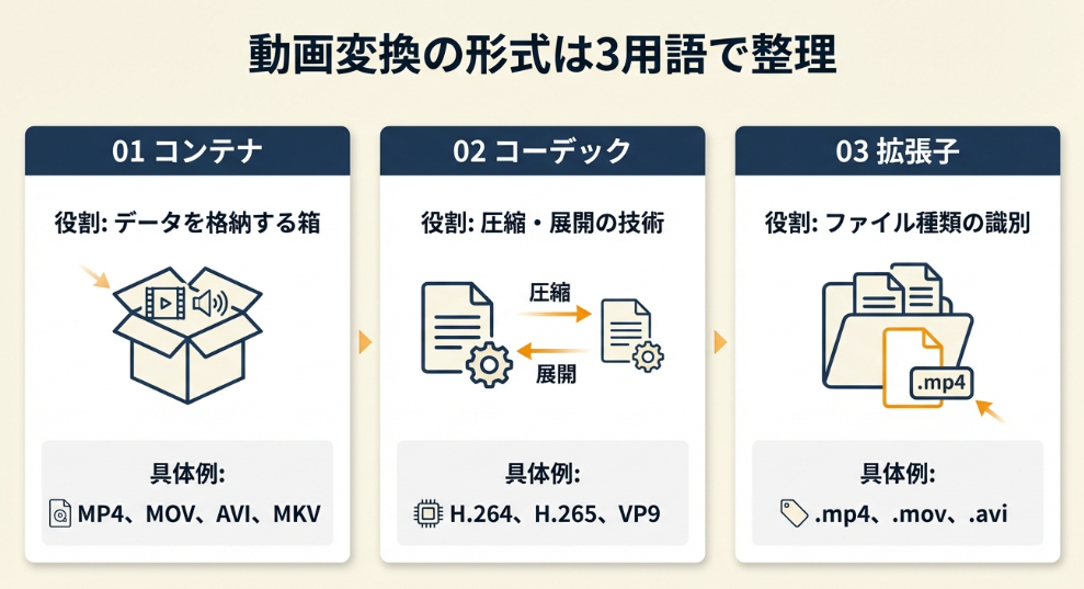 動画形式の違いを理解するには、コンテナ・コーデック・拡張子の3つの用語を押さえてください。