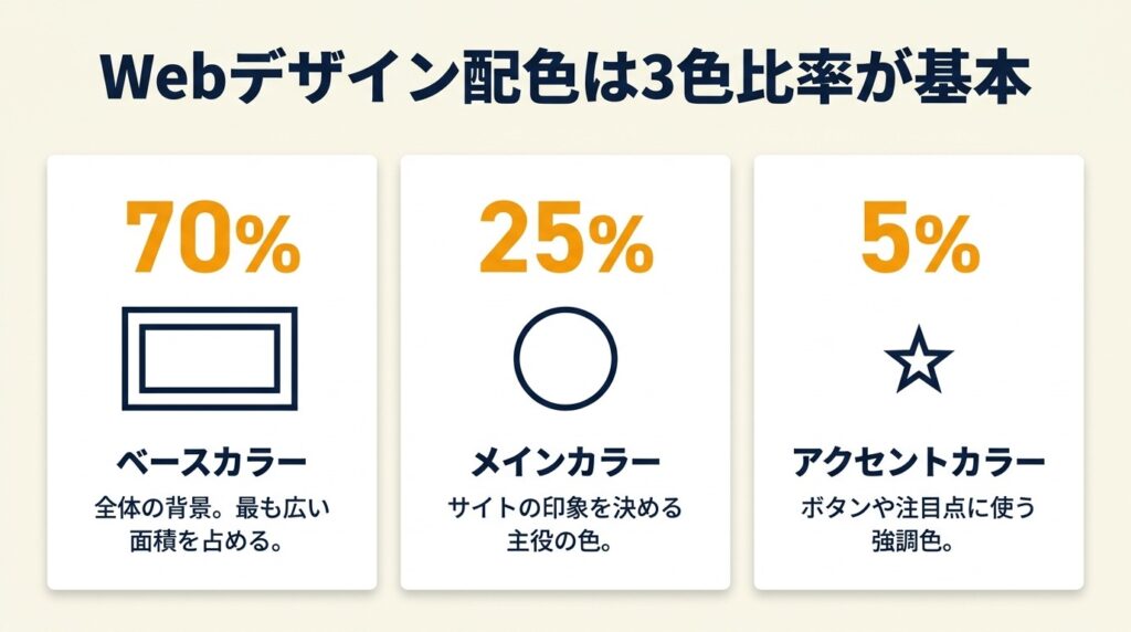 Webデザインの配色は、ベース70%・メイン25%・アクセント5%の3色比率を守るだけで、センスがなくても整ったサイトが作れます。この記事ではメインカラーの選び方から配色ツールの活用まで5つの手順で解説します。