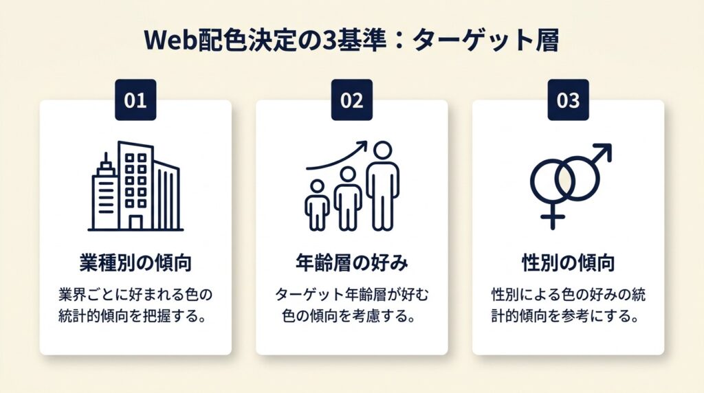 「なんとなく好きな色」を選ぶと、ターゲット層の印象と合わない配色が生まれます。色には業種・年齢層・性別ごとに統計的な傾向があり、これを基準にメインカラーを絞り込むと選択の精度が上がります。