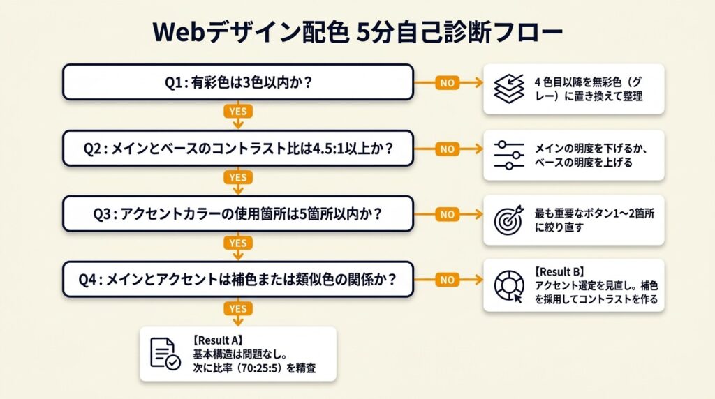 Q2: メインカラーはベースカラーに対して十分なコントラストがありますか?コントラスト比4.5:1以上の場合はQ3へ進んでください。不足している場合は、メインカラーの明度を下げるか、ベースカラーの明度を上げることで改善できます。WebAIM Contrast Checkerに2色の16進数コードを入力すれば即時確認できます。