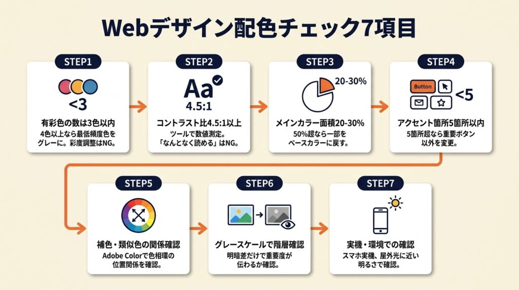 配色を決めた後に確認すべき7項目を以下に示します。この順序で確認すると、問題が発生した場合の修正範囲を最小化できます。制作物を開いた状態で、以下を上から順に確認してください。