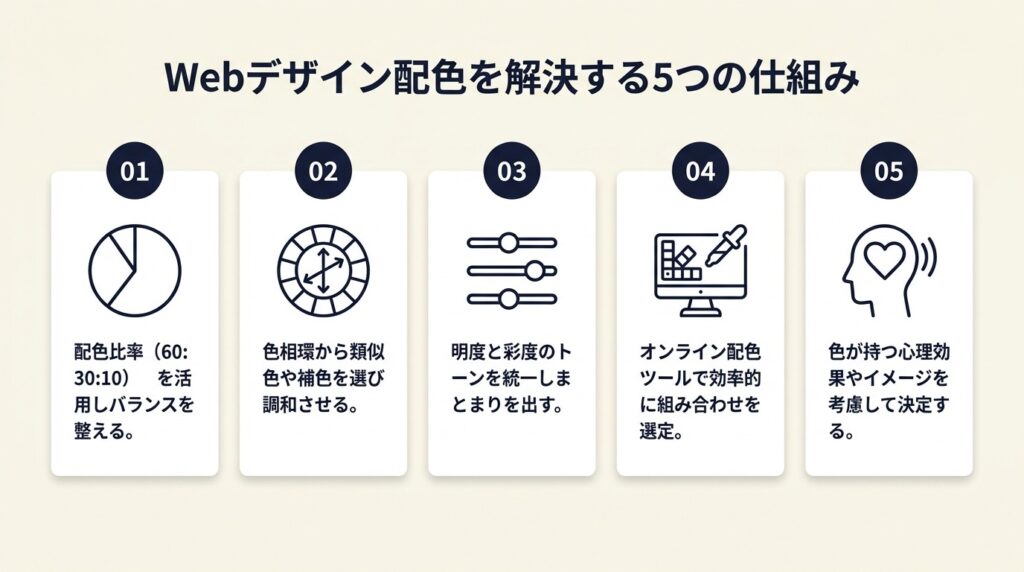 Webデザインの配色は、メインカラーを最初に決め、ベースカラーで可読性を確保し、アクセントカラーをCTAの1〜2箇所に絞るという3ステップで完成します。色数を3色に限定し、70-25-5%の比率を守ることが、センスよりも先に機能するルールです。ツールを使えば最短30分でこの構造を実装できます。