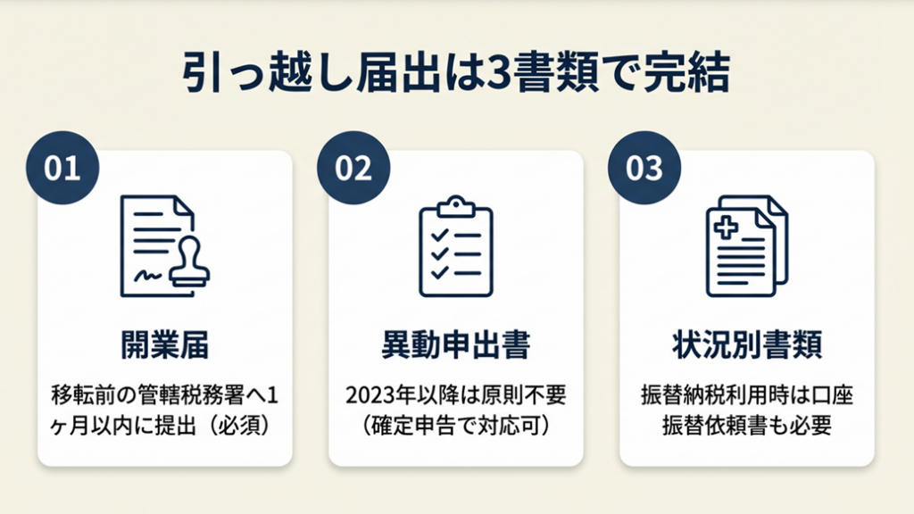 引っ越しのバタバタの中で、税務署への届出の整理に迷う方は少なくありません。主に3つの書類で手続きが完結します。