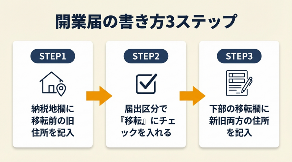 移転前の管轄税務署に、新旧住所を記載した開業届を1ヶ月以内に提出してください。e-Tax・郵送・窓口の3方法から選べます。
