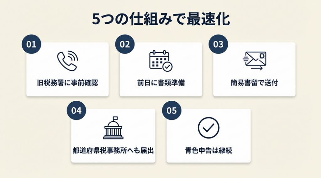- 【なぜ効くのか】: 引っ越し直後は転入届・公共料金変更などで精神的余裕がなくなります。税務署の手続きは罰則がないために後回しにされやすく、1ヶ月後に忘れているケースが多発します。引っ越し前に記入済みの封筒を作ることで「送るだけ」の状態にしておくのが有効です。