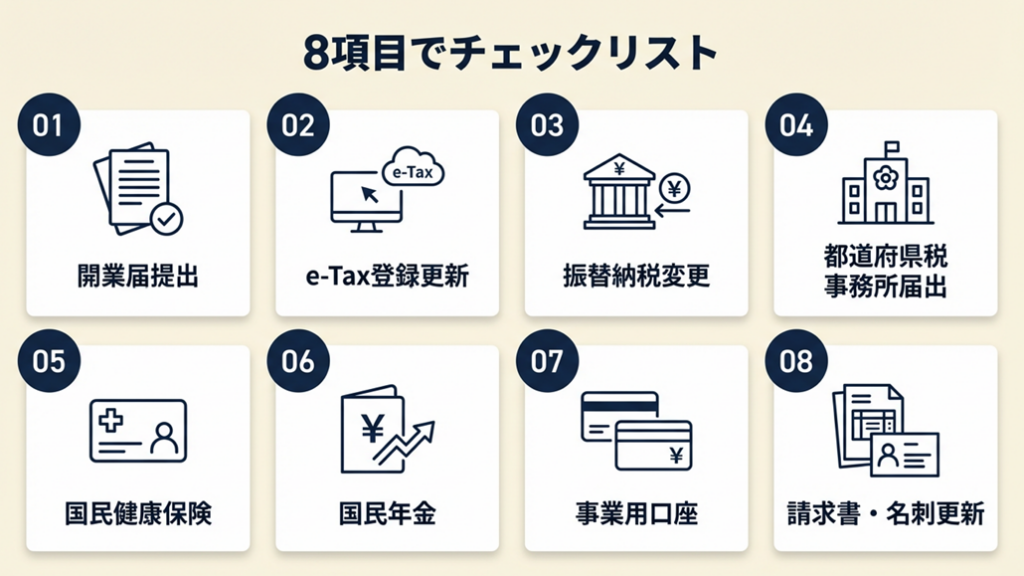 手続き漏れで最も多いのは「開業届を出したつもりが旧住所の税務署に届いていなかった」ケースです。以下の4項目を順番に確認してください。