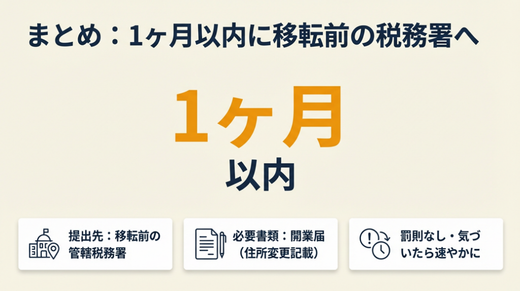 まとめ:個人事業主の引っ越し届出は1ヶ月以内に移転前の税務署へ