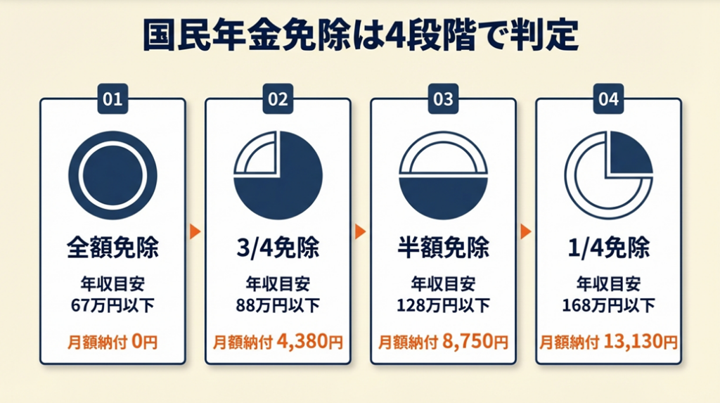免除には「全額・4分の3・半額・4分の1」の4段階があり、それぞれ所得上限と月々の自己負担額が異なります(粕屋町公式サイト「国民年金保険料の免除・猶予・特例」)。